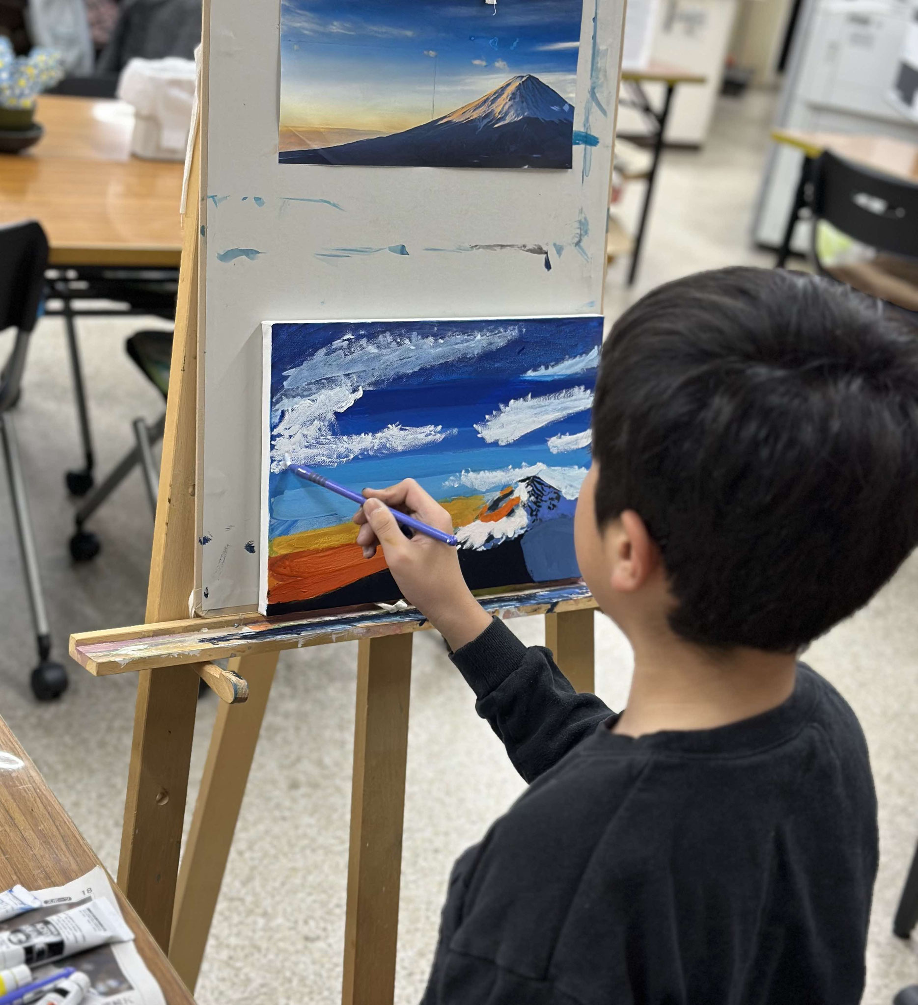 こども美術教室では、お子さんの「絵を描くのが好き」という気持ちを大切にし、カリキュラムに捉われずのびのびと表現する力を養います。対象年齢は幼児から中学生まで、生徒さん達一人一人が自分でテーマを決めて作品制作に励んでいます。